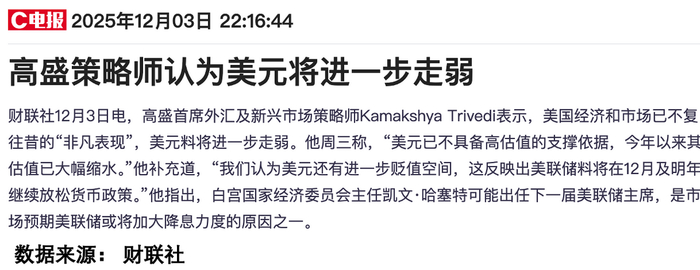 高盛最近说了:美联储12月肯定降息25个基点——因为9月非农数据降温了(官方说增11.9万,高盛自己算才3.9万),而且12月的利率决议在CPI、非农数据之前,不会变。