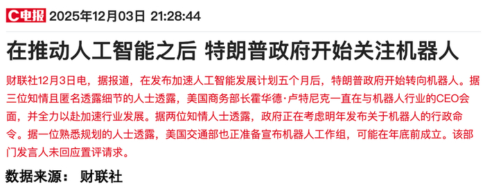美国最近在机器人上搞了不少动作:特朗普政府要发行政命令,交通部要成立机器人工作组,国会议员还想设「国家机器人委员会」,连谷歌支持的Apptronik都喊「要主动搞国家战略」。