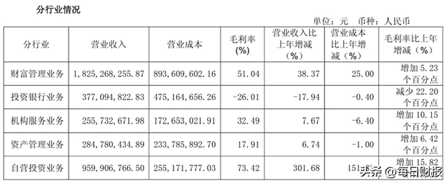 国金证券业绩快速增长,更大的推动力来源于自营业务。今年上半年,财富管理业务收入为18.25亿元,同比增长38.37%;自营业务收入为9.60亿元,同比增长301.68%。