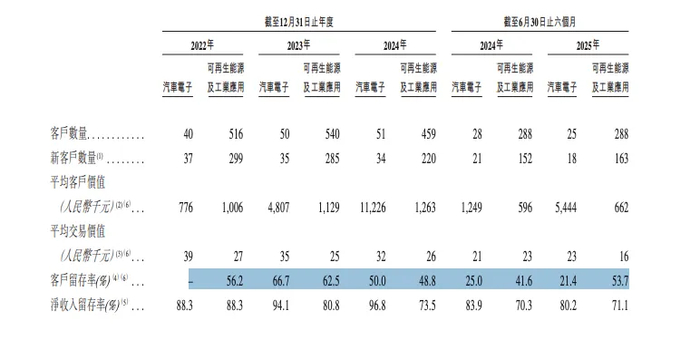 在客户集中度较高的同时,不同领域的客户留存率表现分化。报告期内,公司可再生能源及工业应用领域的客户留存率分别为56.2%、62.5%、48.8%及53.7%,整体呈现下滑趋势。2023年到2024年,汽车电子领域客户留存率从66.7%下滑至50%,到今年上半年下降至21.4%。