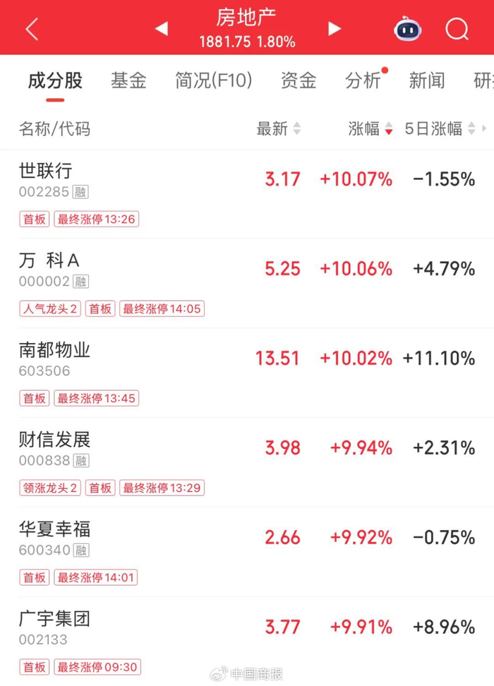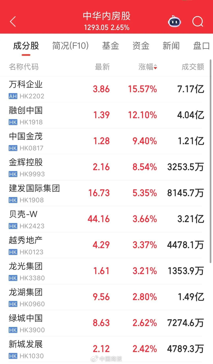 在万科带动下,港股融信中国、融创中国涨超12%,世茂集团涨11%,中国金茂涨逾9%,碧桂园涨超5%。A股财信发展、华夏幸福涨停,金地集团、保利发展、绿地控股等跟涨。