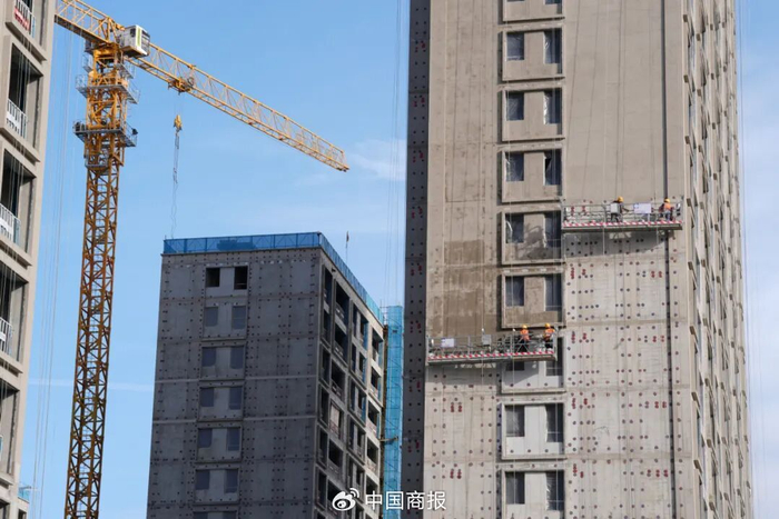 △图为建筑工人在北京一在建楼盘外墙施工。(图片由CNSPHOTO提供)