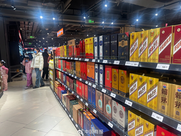 图为超市的白酒售卖区。