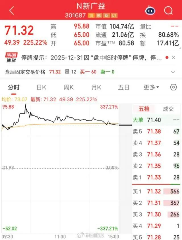 另一只新股新广益盘中一度触发临停,最大涨幅为337.21%。