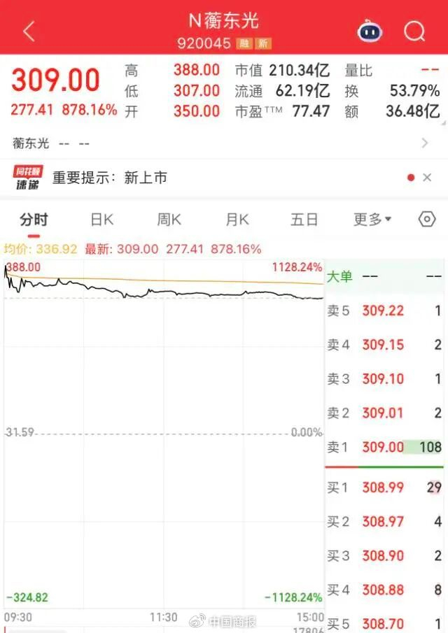 光通信领域“小巨人”蘅东光正式登陆北交所,开盘涨幅达1008%,股价飙升至350元/股,开盘初期成交额便突破6亿元,打新投资者收益瞬间兑现。以发行价31.59元/股计算,中一签(100股)的投资者浮盈高达31841元。另一只新股新广益盘中一度触发临停,最大涨幅为337.21%,上演“年末大红包”行情。