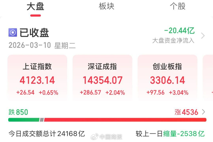 具体来看,A股三大指数集体上涨,市场热点快速轮动。截至收盘,上证指数涨0.65%,深成指涨2.04%,创业板指涨3.04%,北证50指数涨1.94%。沪深京三市成交额为24168亿元,较上一日缩量2538亿元,三市超4500只个股上涨。