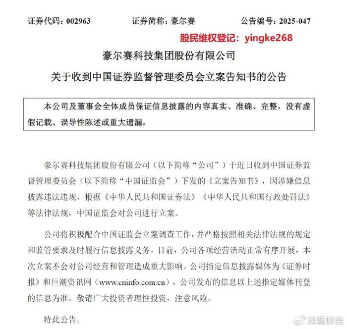 2025年11月21日晚豪尔赛(002963)发布公告称,收到中国证监会下发的《立案告知书》因涉嫌信息披露违法违规,根据《中华人民共和国证券法》《中华人民共和国行政处罚法》等法律法规,中国证监会对公司进行立案。公司将积极配合中国证监会立案调查工作,并严格按照相关法律法规的规定和监管要求及时履行信息披露义务。目前,公司各项经营活动正常有序开展,本次立案不会对公司经营和管理造成重大影响。