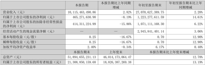 东山精密(002384.SZ)发布2025年第三季度报告。根据披露,2025年第三季度公司实现营业收入101.15亿元,同比增长2.82%,归属于上市公司股东的净利润为4.65亿元,同比下降8.19%。前三季度实现营业收入270.71亿元,同比增长2.28%;归母净利润12.23亿元,同比增长14.61%。