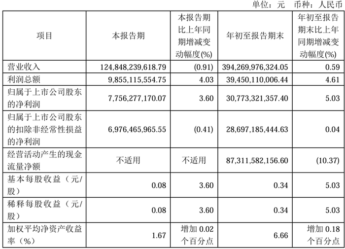 中国电信(601728.SH)发布2025年第三季度报告。根据披露,2025年前三季度,公司营业收入为人民币3943亿元,同比增长0.6%,归属于上市公司股东的净利润为人民币308亿元,同比增长5%。第三季度营业收入1248亿元,同比下降0.91%;归属于上市公司股东的净利润77.56亿元,同比增长3.6%。