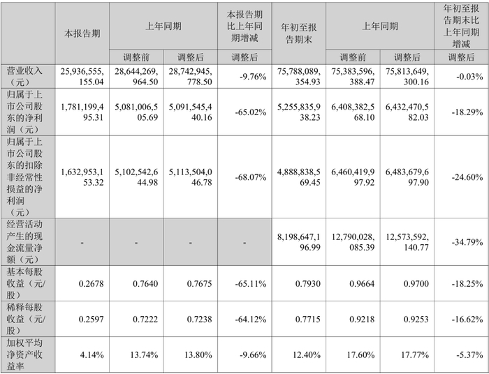 温氏股份(300498.SZ)发布2025年第三季度报告。2025年三季度,公司实现营业收入为259.37亿元,同比下降9.76%,归属于上市公司股东的净利润为17.81亿元,同比下降65.02%。年初至报告期末,公司营业收入为757.88亿元,同比下降0.03%,归属于上市公司股东的净利润为52.56亿元,同比下降18.29%。