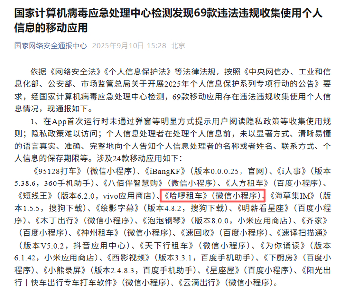 在租车业务板块,2025年9月,哈啰租车因“未提供个人信息撤回同意”“自动化营销缺乏非定向选项”等问题,被国家计算机病毒应急处理中心公开通报。