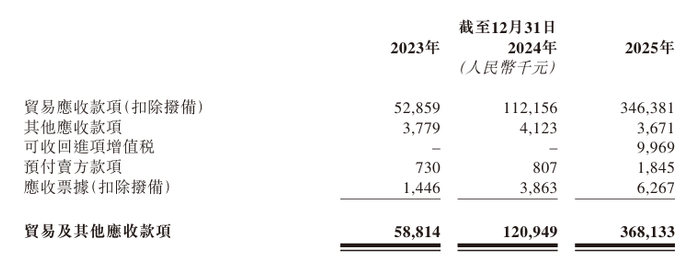 来源:承泰科技招股书结果就是,公司经营活动现金流连续三年净流出,2023年至2025年分别为-6189万元、-698万元及-1.38亿元。2025年高达1.38亿元的“失血”,主要归因于为应对暴增的订单而进行的大规模备货采购,以及不断攀升的应收账款。