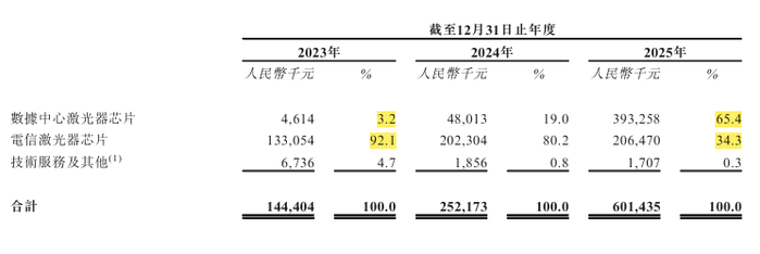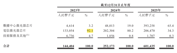 将时间拨回到2024年,彼时的源杰科技远没有今日的荣光。招股书显示,公司2023年来自电信激光器芯片的收入占比高达92.1%,而数据中心芯片仅占3.2%。这种过度依赖电信市场的结构,在5G建设放缓、价格战惨烈的背景下,成了致命的软肋。