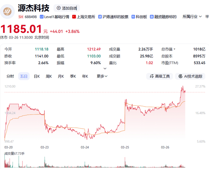 来源:百度股市通提示:按照2025年4月9日最低价算88.10到2026年3月26日午间收盘,源杰科技涨幅超10倍。