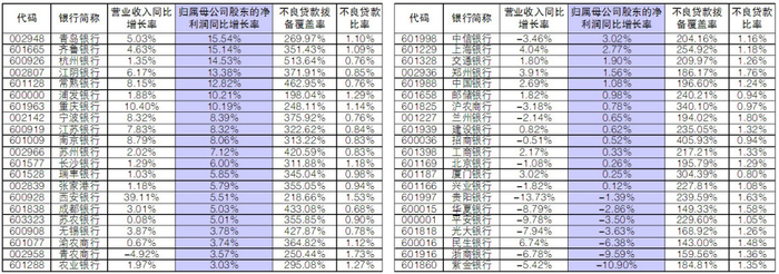 综合42家银行的净利润指标发现,三季报数据相较中报有所改善,净利润同比下滑的银行数目从中报时的9家减至7家,同比双位数增长的银行数目较中报时增加1家。