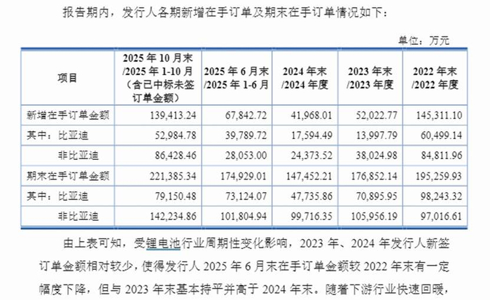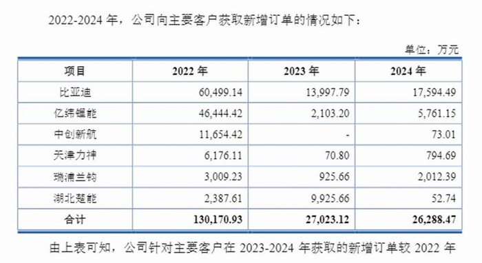 此外,截至2025年上半年,公司没有蜂巢能源的在手订单,对宁德时代在手订单金额不高,以及对稳定大客户亿纬锂能的在手订单明显低于2025年上半年公司对其销售额,部分主要客户2022—2024年新增订单出现下降,这些情形及其原因同样可能需要关注。
