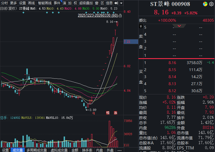 今日早盘,ST景峰(000908)股价再度涨停。在撤销退市风险警示后,该股已连续三个交易日涨停,加上停牌前的连续封板,强势走出18天14板。凭借这波拉升,ST景峰股价创下自2017年1月以来的新高。
