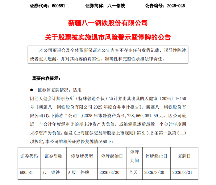 29日下午,八一钢铁突然宣布,公司股票3月30日停牌一天,其简称将自3月31日起变更为*ST八钢。被实施退市风险警示的原因,系公司2025年末净资产为负(-17.29亿元),触及《上海证券交易所股票上市规则》第9.3.2条第一款第(二)项规定。