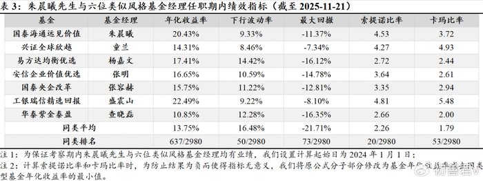 从回撤来看,国泰海通远见价值的风控也居前。自2024年1月1日以来,截至2025年11月21日,产品的下行波动率和最大回撤分别位居全市场同类基金的前2%和前3%;而与六位类似风格基金经理相比,两项指标也均排在第3/7位。