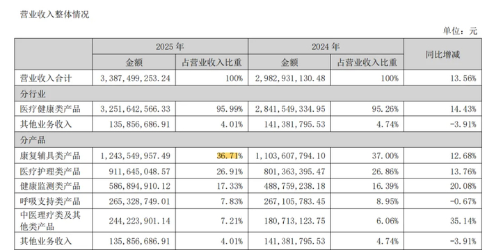 效果立竿见影。健康监测类产品收入同比增长20.08%,毛利率飙升7.87个百分点至50.13%。这里跑出了两个“爆款”:全球首创的血糖尿酸双测条(一滴血、10秒双测)和预热款体温计。康复辅具类作为第一大收入板块(占比36.71%),以62.10%的毛利率贡献了12.68%的稳健增长,其中被收购而来的“背背佳”依然是现金牛,无痕款矫姿带在抖音等渠道持续收割流量。