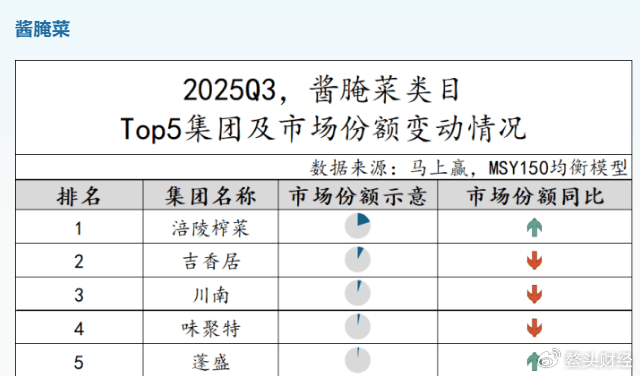 最后,行业内部的分化进一步加剧了市场竞争的残酷性。线下零售监测机构马上赢的数据显示,2024年涪陵榨菜以15.98%的市场份额占据酱腌菜赛道绝对龙头地位,而吉香居的市场份额仅为9.25%,且市场份额仍在下降。这意味着在存量市场的竞争中,吉香居的核心竞争力仍显不足。