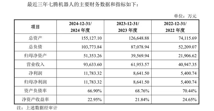 财务数据显示,2022年-2024年,七腾机器人公司的营业收入分别为4.09亿元、6.20亿元、9.36亿元,净利润分别为5400.74万元、8641.5万元、1.18亿元。截至2024年12月31日末,七腾机器人公司的资产总额为15.51亿元,负债总额为10.38亿元,净资产为5.14亿元。