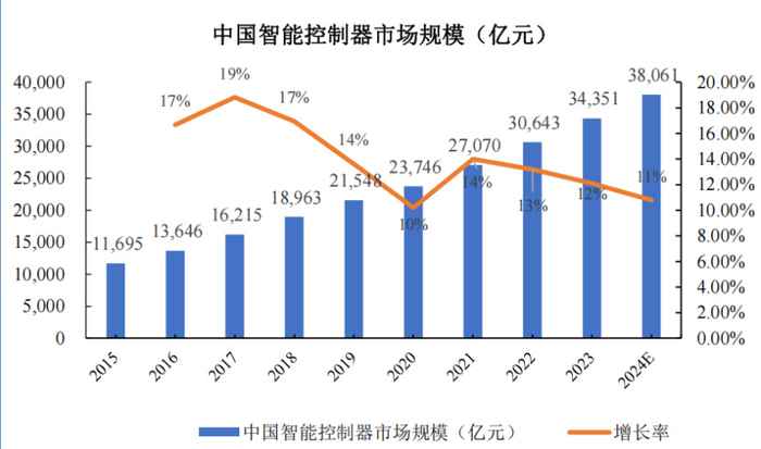 Frost&Sullivan披露的数据显示,国内智能控制器市场规模从2015年的11695亿元上升至2024年的38061亿元,年复合增长率高达14.01%,增速远高于其他国家。