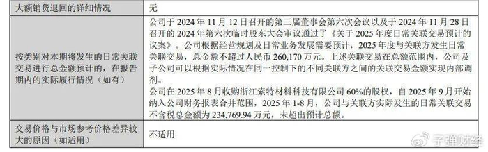 根据公司年报披露信息,公司年初对本年度与浙江索特的关联交易预计额度为不超过26亿元,而2025年实际发生的关联交易金额为23.47亿元,虽未超出预计总额,但已无限贴近额度上限,属于典型的“贴边过线”。