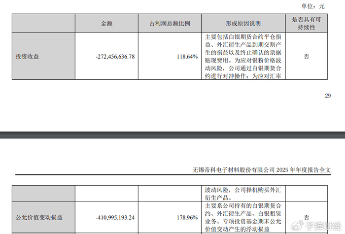 最终结果反映在2025年年报中。2025年年报,帝科股份非经常损益科目明确表述,除同公司正常经营业务相关的有效套期保值业务外,非金融企业持有金融资产和金融负债产生的公允价值变动损益以及处置金融资产和金融负债产生的损益,这部分金额高达6.41亿元。