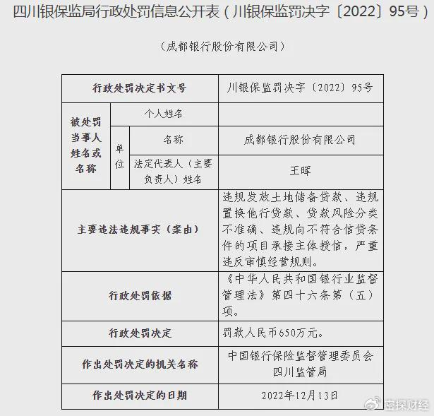 2022年底,成都银行因违规发放土储贷款、违规置换他行贷款、贷款风险分类不准确、违规向不符合信贷条件的项目承接主体授信,严重违反审慎经营规则而被四川金融监管局处罚了650万元,负有直接领导责任的李爱兰被罚8万元。
