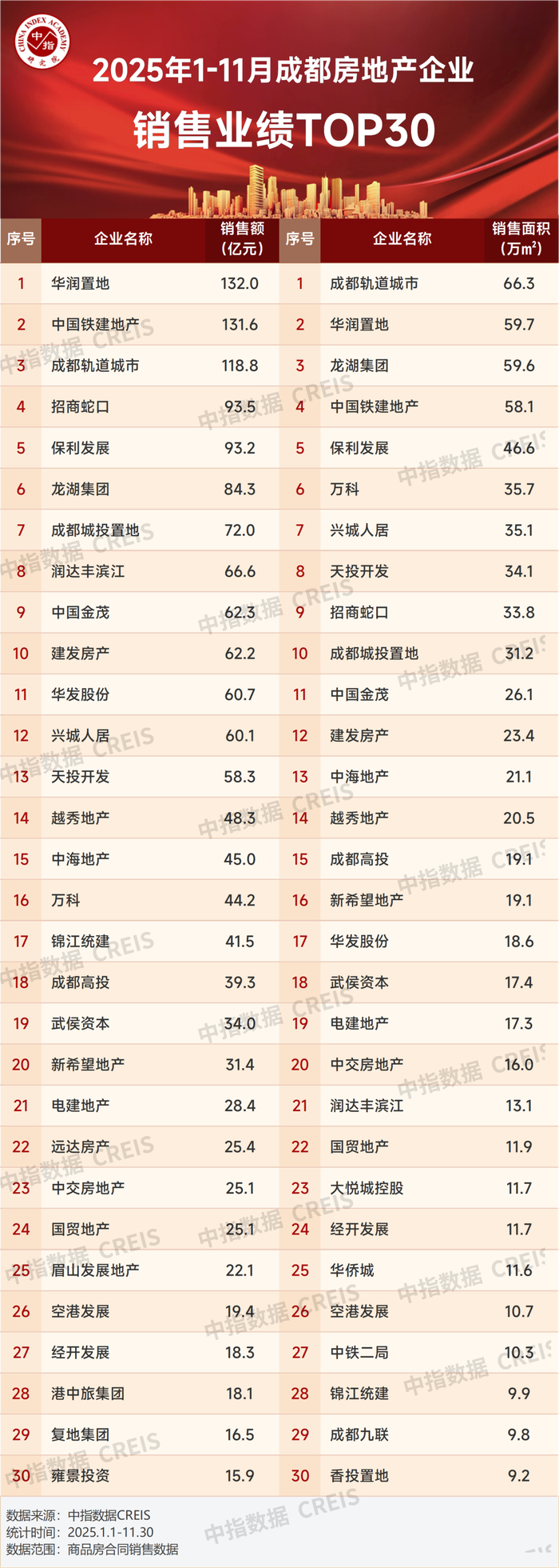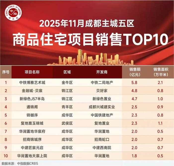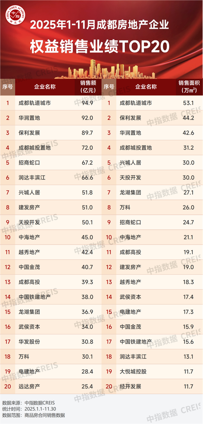 数据说明:房地产企业销售数据统计是以2025年1月1日-11月30日期间销售的商品房为统计口径,主要依据中指数据CREIS(点击查看)在成都的销售监测数据,并参考当期总体经营情况和推盘去化情况进行分析统计;对于少数没有在监测范围内的项目,由企业提供相关证明文件,经课题组对数据进行严格审核,也纳入统计范围。本报告仅供参考,课题组不对使用报告及其内容所引发的任何直接或间接损失承担责任。