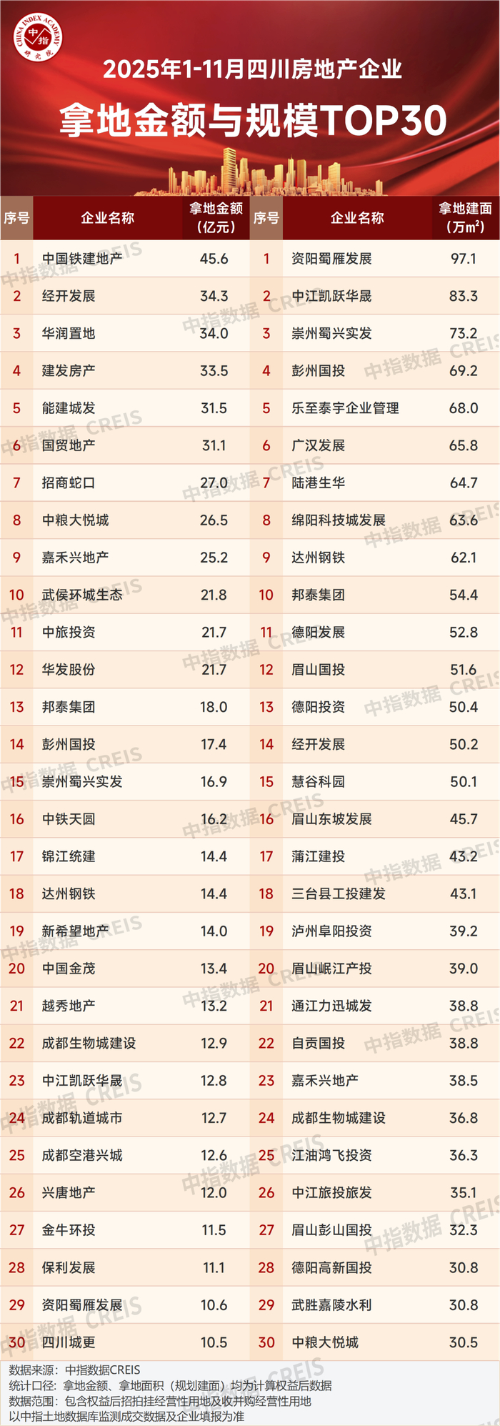 数据说明:房地产企业销售数据统计是以2025年1月1日-11月30日期间销售的商品房为统计口径,主要依据中指数据CREIS(点击查看)在四川的销售监测数据,并参考当期总体经营情况和推盘去化情况进行分析统计;对于少数没有在监测范围内的项目,由企业提供相关证明文件,经课题组对数据进行严格审核,也纳入统计范围。本报告仅供参考,课题组不对使用报告及其内容所引发的任何直接或间接损失承担责任。