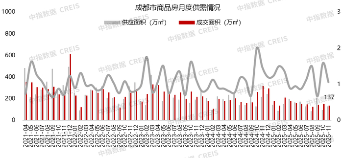 11月,成都商品房供应约128.5万㎡,成交面积约为136.9万㎡。1-11月累计供应1576.7万㎡,成交1703.9万㎡。