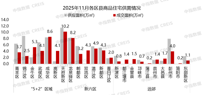 11月,天府新区商品住宅供应面积为11.5万㎡,为成都市最高;其次为锦江区的8.9万㎡。11月,天府新区商品住宅成交面积为10.2万㎡,为成都市最高;其次为成华区的8.6万㎡。