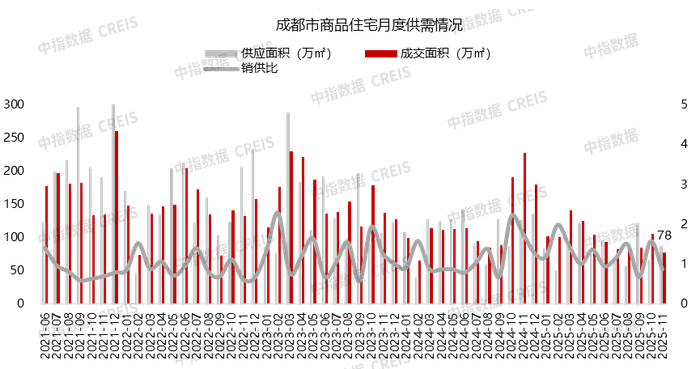 2025年11月,成都新建商品房供应约128.5万㎡,成交约136.9万㎡;商品住宅供应约88.0万㎡,成交约78.3万㎡。TOP30房地产企业1-11月累计实现在蓉销售金额约1593.9亿元,成交面积约768.5万㎡。