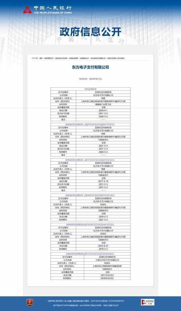 公开资料显示,东方支付成立于2008年,于2011年5月18日正式获得中国人民银行首批发放的“支付业务许可证”。主要业务包括全国海关税费电子支付业务、自贸区业务,跨境人民币、跨境外汇支付业务。央行官网信息显示,东方支付的业务类型为储值账户运营Ⅰ类,有效期至2026年5月2日。