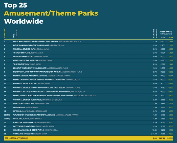 美国的迪士尼魔法王国和迪士尼乐园的游客总量名列2024年全球前25大娱乐/主题公园的前两位,日本的日本环球影城和东京迪士尼乐园名列第三、四位,中国的上海迪士尼乐园和长隆海洋王国名列第五、六位。