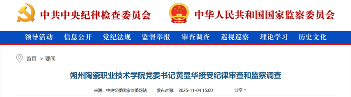 中央纪委国家监委网站11月4日消息,据山西省纪委监委消息:朔州陶瓷职业技术学院党委书记黄显华涉嫌严重违纪违法,自动投案,目前正接受山西省纪委监委纪律审查和监察调查。