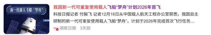 记者12月16日从中国载人航天工程办公室获悉,我国自主研制的新一代可重复使用载人飞船“梦舟”,计划于2026年完成首次飞行任务。