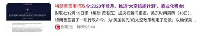 据央视新闻报道,美东时间周四(18日),特朗普签署了一项行政命令,为“美国优先”的太空政策制定了愿景,以确保美国在太空探索、安全和商业领域“引领世界”。