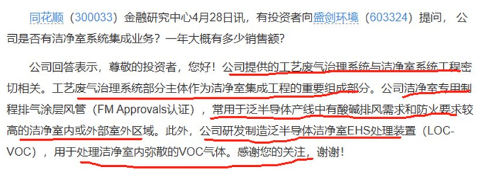 半导体洁净室设备:公司提供的工艺废气治理系统,部分主体为洁净室集成工程的重要组成部分;公司相关产品有洁净室专用制程排气涂层风管、LocalVOC。