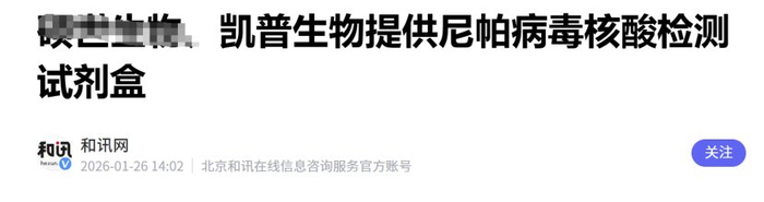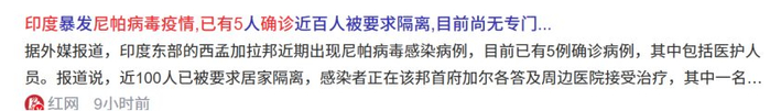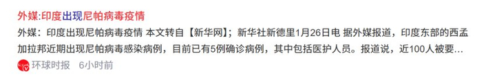 2026年1月26日,据外媒报道,印度尼帕病毒疫情已有5例确诊。包括数名医护人员,近100人被紧急隔离。
