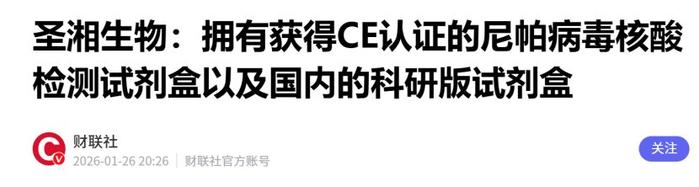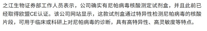 尼帕病毒检测:公司确实有尼帕病毒核酸测定试剂盒,并且此前已经取得欧盟CE认证,可用于临床或科研上对尼帕病毒的诊断,具有高特异性、高灵敏度等特点,但目前尚无印度地区订单。