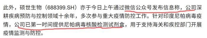 每次发生重大的公共卫生事件,对医药股来说都是利好。尽管,目前没有明确表示有疫苗可以治疗尼帕病毒,但部分公司在检测、防治方面具备很好的效果。