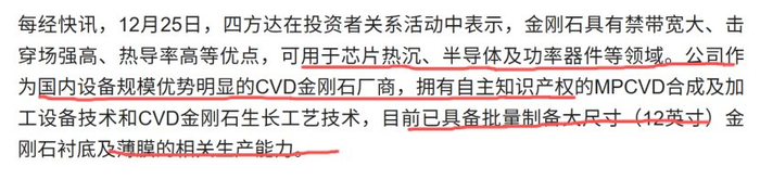 钻石散热产品:公司表示从热沉片上切割出来所需要的形状,以某种方式贴合在芯片上,做成顶级散热器,这将大大促进高功率器件、5g/6G通信、AI算力性能的提升。已经成功研制出国内可量产的最大8英寸热沉片。据悉,公司热沉片生产车间将于今年2月份投入量产,这是功能性金刚石从实验室,迈向规模化商业应用的一个里程碑。
