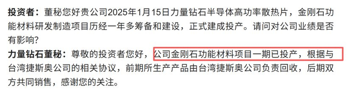 钻石散热产品:公司半导体(金刚石)散热片项目一期已投产,由合作方台湾捷斯奥公司包销。