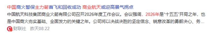 1月29日,中国航天科技集团商业火箭有限公司召开2026年度工作会议,2026年坚决打赢主力箭首飞及回收攻坚战,全力突破可重复使用技术。