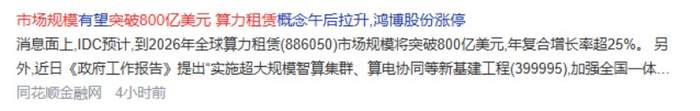 消息面上,IDC预计,到2026年全球算力租赁市场规模将突破800亿美元,年复合增长率超25%。中研普华产业研究院预测,到2026年,中国算力租赁潜在收入市场规模有望达到2600亿元,并以每年20%以上的速度快速增长。