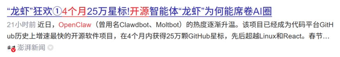 与此同时,2026年初以来,开源AI智能体OpenClaw持续出圈,OpenClaw项目已经成为代码平台GitHub历史上增速最快的开源软件项目,在4个月内获得25万颗GitHub星标,先后超越Linux和React。