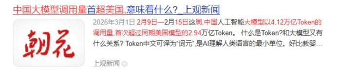 算力租赁需求暴增的背后是AI大模型toke的点击量持续爆量。根据海外AI模型聚合平台OpenRouter数据显示,目前该平台的周度token消耗量接近14T的水平,较2025年年底时翻番。2月9日—15日当周,中国大模型以4.12万亿Token的调用量首次超过同期美国模型的2.94万亿Token。
